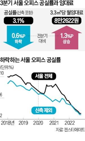 거래가 실종된 건 금리 상승으로 시장 환경이 어려워졌음에도 불구하고 매도자들의 눈높이가 좀처럼 내려가지 않고 있기 때문이다. 젠스타메이트 부동산 연구소에 따르면 올해 3분기 서울 오피스 빌딩의 공실률은 3.1%로 전 분기 대비 0.6%포인트 하락했다. 같은 기간 임대료는 1.3% 올랐다. 서울 오피스 공실률은 작년 말과 비교하면 2.4%포인트나 내렸다. 강남권역 공실률이 1.6%로 가장 낮고 여의도는 2.3%였다. 서울 도심(종로구 중구 일대)은 4.9%로 권역 중 높은 편이지만 역대 최저 수준이다. 이경자 삼성증권 연구원은 “3분기 서울 오피스 임대료는 3.3㎡당 12만7000원으로 작년보다 3.2% 상승했다”고 말했다.