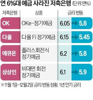 2일 금융권에 따르면 한국은행이 지난달 24일 기준금리를 0.25%포인트 올렸지만 은행 예금금리는 오히려 하락하고 있다. 금융당국의 경고 이후 은행들이 예금금리를 떨어뜨리며 수신 경쟁을 포기하자 저축은행도 앞다퉈 예금금리를 내리고 있다. OK·다올·애큐온·상상인 등 주요 저축은행 예금금리가 연 5%대로 주저앉았고 시중은행에선 연 5%대 정기예금이 자취를 감추고 있다.