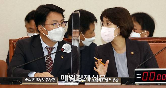 이영 중소벤처기업부 장관이 2일 국회 산업통상자원중소벤처기업위원회에서 조주현 차관과 대화를 하고있다. 2022.12.2 [김호영기자]