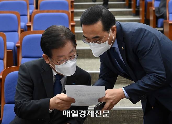 이재명 더불어민주당 대표와 박홍근 더불어민주당 원내대표가 2일 서울 여의도 국회에서 열린 의원총회에서 대화하고 있다.