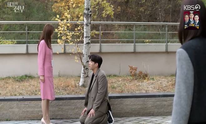 2일 방송된 KBS 2TV ‘태풍의 신부’에선 바다(오승아 분) 앞에 무릎을 꿇고 자신을 놓아 달라고 호소하는 산들(박윤재 분)의 모습이 그려졌다.