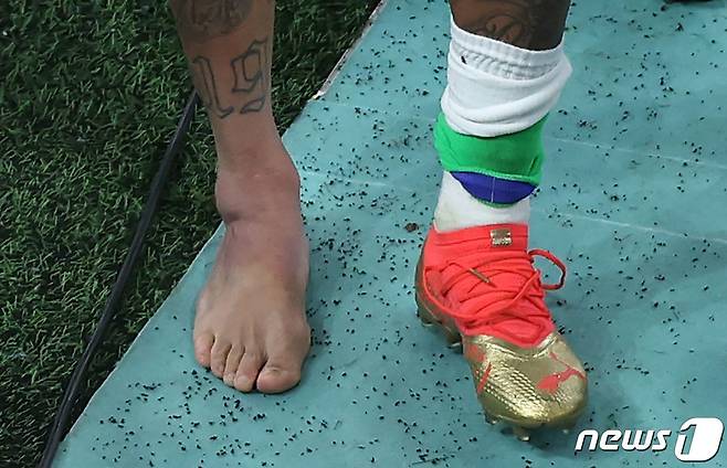(루사일 AFP=뉴스1) 정윤미 기자 = 브라질 축구스타 네이마르 주니어(파리 생제르맹) 선수가 발목 부상으로 남은 월드컵 경기 출장이 어려울 수 있다고 영국 매체 더선이 2일(현지시간) 보도했다. 네이마르 선수는 앞서 24일 카타르 월드컵 조별리그 G조 1차전에서 세르비아 수비수와 충돌해 오른 발목에 부상을 입고 퇴장했다. 사진 속 그의 오른 발목이 부어있다. 2022.12.02