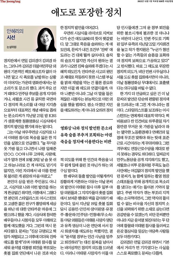 | ▲ 12월 1일자 <중앙일보>에 실린 안혜리 논설위원의 '애도로 포장한 정치' |