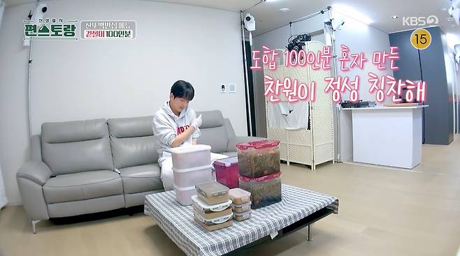 찬또백반집의 첫 번째 반찬은 쌈장 닭갈비. 이찬원은 양념에 잰 100인분의 닭갈비를 4L 반찬 통 3개에 꾹꾹 눌러 담았다.