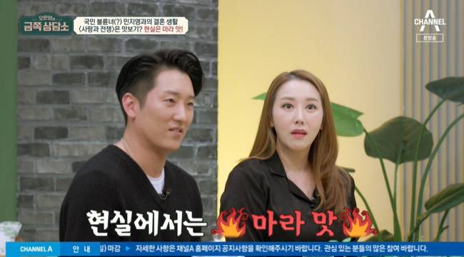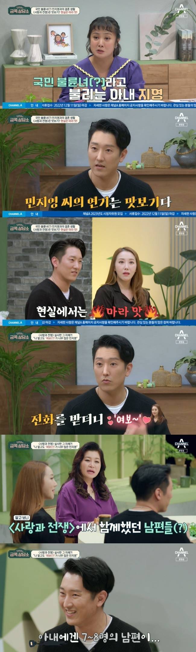 김형균은 “결혼 5년 차인데 민지영 씨의 연기는 맛보기다. 현실에서 민지영은 마라 맛 연기를 한다. ‘사랑과 전쟁’은 예고편 수준이다”라고 말해 민지영을 당황케 했다.