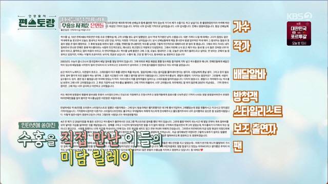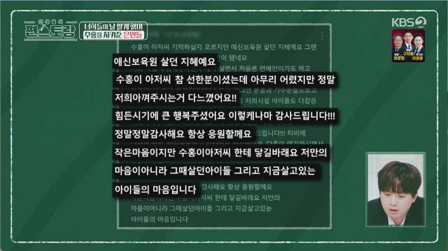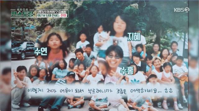 수연 씨는 "나중에 얼핏 듣기로는 행사 제의가 들어오면 행사비 대신 아이들도 참여하게 해달라 했다더라"며 "저희에게는 수홍 아저씨가 키다리 아저씨다. 보육원 차량이 낡았다는 소식을 듣고 같은 보육원 출신 동생과 적금 모은 걸로 후원금을 드리러 갔는데 알고 보니까 아저씨가 1000만 원을 보태주셨더라"라고 했다. 수연 씨는 "저는 (르포 방송) 출연 제의 1초도 고민 안했다"라 말해 눈물바다가 됐다.