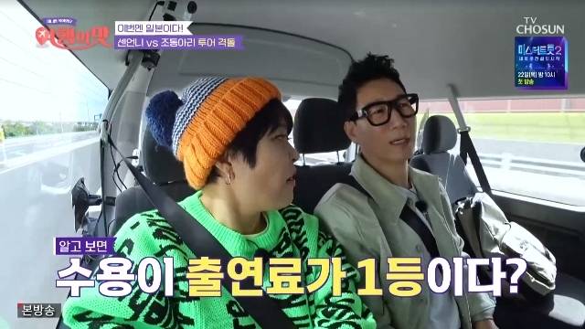 이에 지석진은 "사실 수용이 출연료가 제일 많은 것 아냐"고 입을 열었다. 그러곤 "말한 거에 비해. 쟤가 한마디당 얼마인지 아냐"고 덧붙여 웃음케 했다. 박미선은 "수용 씨가 마진이 제일 남는다"고 받아쳤다.