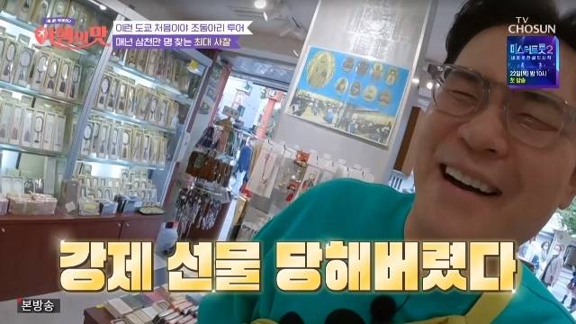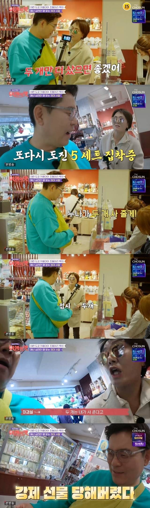 필요없다는데도 강제 선물을 당한 김용만은 "내가 3개 사겠다는데 왜 5개를"이라며 황당한 표정을 지어 웃음케 했다. (사진=TV조선 '여행의 맛' 캡처)