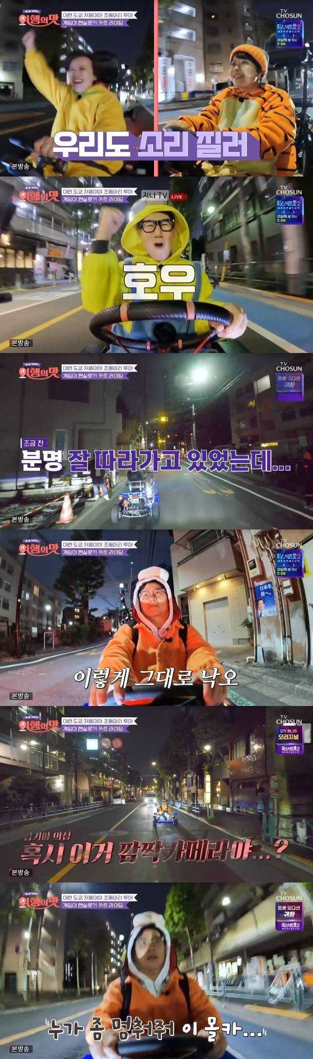 좁은 골목을 벗어나니 한층 넓어진 도로. 이들은 더욱 빠른 속도로 카트 라이딩을 즐겼다. 잔뜩 신난 지석진은 "너무나 즐겁다. 정말 꿈 속에서나 생각할 상상도 못할 일이 현실에서 벌어지고 있다. 흥분을 감출 수 없다"고 목소리 높였다.
