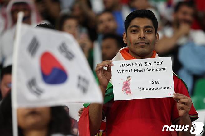 (알라이얀(카타르)=뉴스1) 이동해 기자 = 2일 오후(현지시간) 카타르 알라이얀 에듀케이션 시티 스타디움에서 열린 2022 카타르 월드컵 조별리그 H조 3차전 대한민국과 포르투갈의 경기에서 포루투갈 팬들이 피켓 응원을 펼치고 있다. 2022.12.3/뉴스1