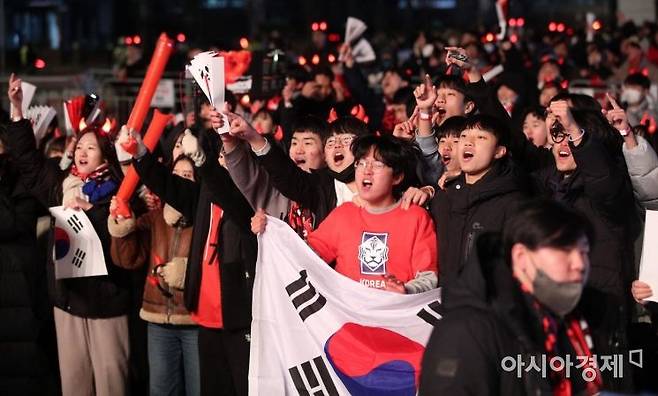2022 카타르 월드컵 조별리그 H조 3차전 대한민국과 포르투갈의 경기를 앞둔 2일 서울 광화문광장에서 붉은악마들과 시민들이 열띤 응원을 펼치고 있다./김현민 기자 kimhyun81@