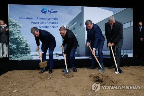epa10344112 (L-R) Belgian Prime Minister Alexander De Croo, Mike McDermott Chief Global Supply Officer, Executive Vice President of Pfizer, Flemish Minister President Jan Jambon and Manager Director of Pfizer Puurs, Luc Van Steenwinkel inaugurate the expansion works after a press conference at the Pfizer factory which announces an investment of more than 1.2 billion euros over the next three years in its production site in Puurs, Belgium, 02 December 2022. EPA/STEPHANIE LECOCQ