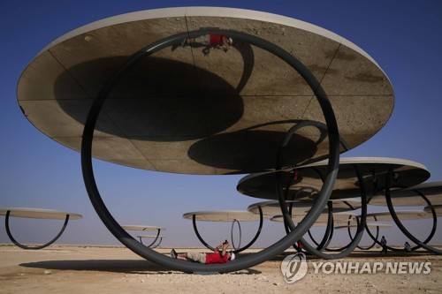A man take pictures at the Olafur Eliasson's Circular Mirror Installation near Al-Ruwais, in north Doha, Qatar, Friday, Dec. 2, 2022. Germany (AP Photo/Matthias Schrader)