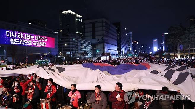 (서울=연합뉴스) 황광모 기자 = 2일 밤 서울 종로구 광화문 광장에서 열린 2022 카타르 월드컵 H조 예선 한국과 포르투갈 경기 합동 응원에 나선 붉은악마와 시민들이 대형 태극기를 펼치며 응원을 펼치고 있다. 2022.12.2