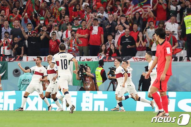 (알라이얀(카타르)=뉴스1) 이동해 기자 = 2일 오후(현지시간) 카타르 알라이얀 에듀케이션 시티 스타디움에서 열린 2022 카타르 월드컵 조별리그 H조 3차전 대한민국과 포르투갈의 경기에서 포르투갈 히카르두 오르타가 선제골을 기록하고 있다. 2022.12.3/뉴스1