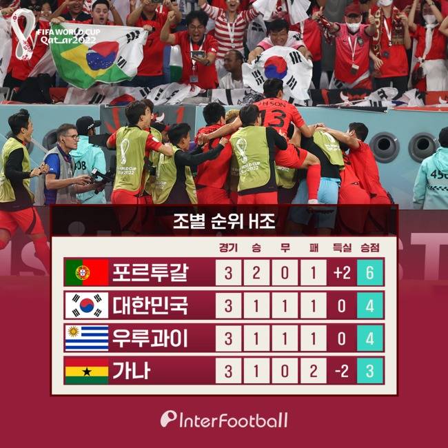 G조, H조 3차전 일정이 모두 끝나면서 2022 국제축구연맹(FIFA) 카타르 월드컵 16강 대진이 확정됐다. 대한민국도 마지막에 조별리그를 통과했다. 우루과이(0-0 무), 가나(2-3 패)를 상대로 1무 1패를 기록한 한국은 포르투갈을 무조건 잡고 우루과이와 가나의 경기 결과를 지켜봐야 했다.