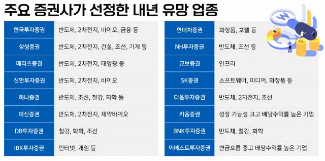 대부분의 증권사는 내년 하반기 업황이 좋아질 것으로 전망되는 반도체와, 전기차 시장 성장에 따른 수혜가 예상되는 2차 전지를 유망 업종으로 꼽았습니다. 내년 실적이 좋아질 것으로 예상되는 조선주와 올해 낙폭이 과했던 화장품주와 게임주, 내년에도 고성장세가 예상되는 제약바이오주도 이름을 올렸습니다. 이밖에 내년 경기침체 우려가 여전한 만큼, 주가 하락을 어느 정도 방어할 수 있는 배당주 등도 관심을 가져볼 만한 종목으로 추천했습니다.