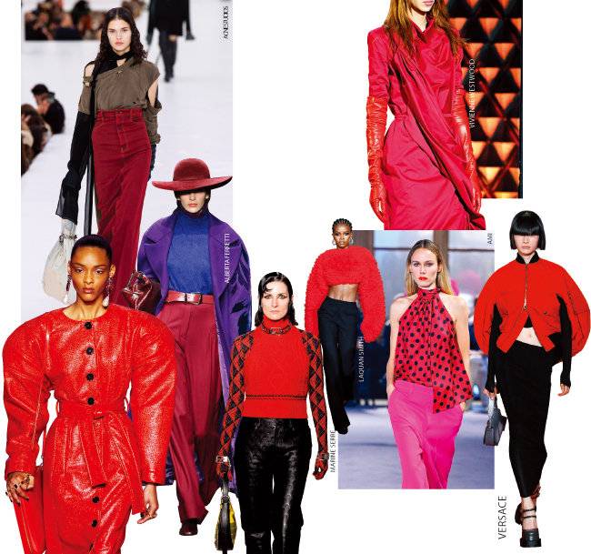 홀리데이 시즌 시그니처 컬러는 레드. 레드 컬러를 포인트로 활용할 때 기억할 점은 소재와 패턴을 과감하게 레이어드해야 특별해 보인다는 것. 레드 베스트를 마린세르의 컬렉션처럼 패턴이 들어간 슬림한 이너 웨어와 레이어드하는 식이다. 오프숄더, 컷오프 스타일 블라우스를 입고 싶다면 퍼 이어링이나 넥워머, 헤어밴드 등 포근한 액세서리로 겨울 무드를 맞추면 된다. 레드 컬러 롱스커트 포인트에 빈티지한 느낌의 원숄더 맨투맨 상의가 밋밋해 보이지 않도록 핸드 워머를 매치한 아크네스튜디오의 룩이 좋은 샘플. 심플한 레드 컬러 스웨터나 터틀넥이 있다면 밑단을 고무줄로 묶은 다음 안으로 말아 넣어 크롭트 기장으로 연출해도 감각적이다.