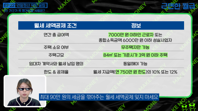 고소득자도 아니고 아이도 없는 사회 초년생 1인 가구를 위한 팁도 있습니다. 청년이면 대부분 가입해 있을 주택청약통장 납입액도 공제 대상 입니다. 총급여액 7000만원 이하고 무주택자인 근로자라면 주택마련 저축에 연 240만원 한도 내에서 40%까지 공제 받을 수 있습니다. 또 월세족이라면 최대 90만원의 세금을 깎아주는 월세 세액공제를 잊지 마셔야 합니다. 총급여액 700만원 이하, 무주택 세대주, 시가 3억원 이하의 주택 거주자라면 총 한도 750만원 이내에서 세액공제가 가능합니다. 연말정산할 때 꼭 항목에 추가하고 임대차계약서 사본, 주민등록등본, 월세 지급 증명 서류를 제출하면 됩니다. 이거 꽤 쏠쏠하니 꼭 챙기세요.