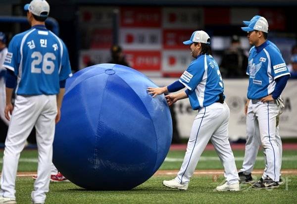 3일 서울 고척스카이돔에서 ‘2022 희망더하기 자선야구대회’가 열렸다. 종범신 팀 김선빈이 투수로 나서 대형 풍선볼을 던지고 있다.
