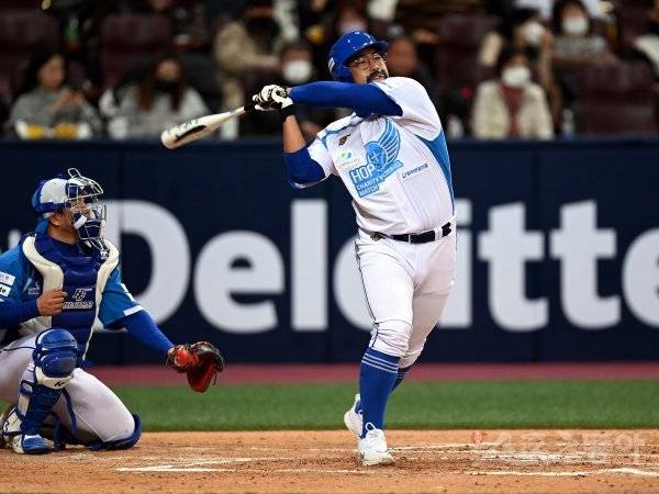 3일 서울 고척스카이돔에서 ‘2022 희망더하기 자선야구대회’가 열렸다. 양신 팀 강백호가 박용택 타격을 따라하고 있다.