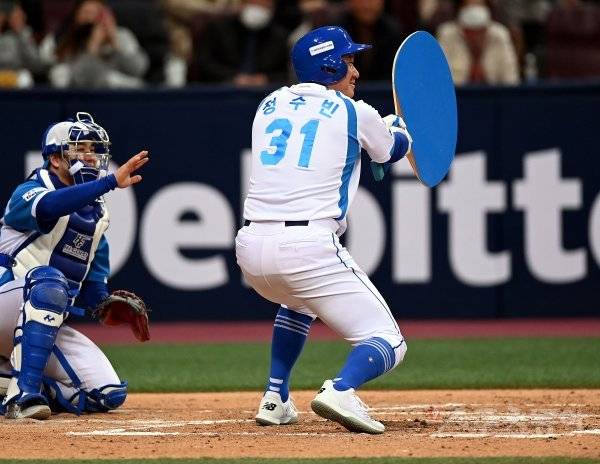 3일 서울 고척스카이돔에서 ‘2022 희망더하기 자선야구대회’가 열렸다. 양신 팀 김태군이 정수빈 유니폼을 입고 대형 탁구채를 들고 타격을 펼치고 있다.