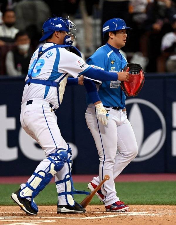 3일 서울 고척스카이돔에서 ‘2022 희망더하기 자선야구대회’가 열렸다. 1회초 종범신 팀 최재훈이 노시환의 투구에 맞은 뒤 어필하고 있다.