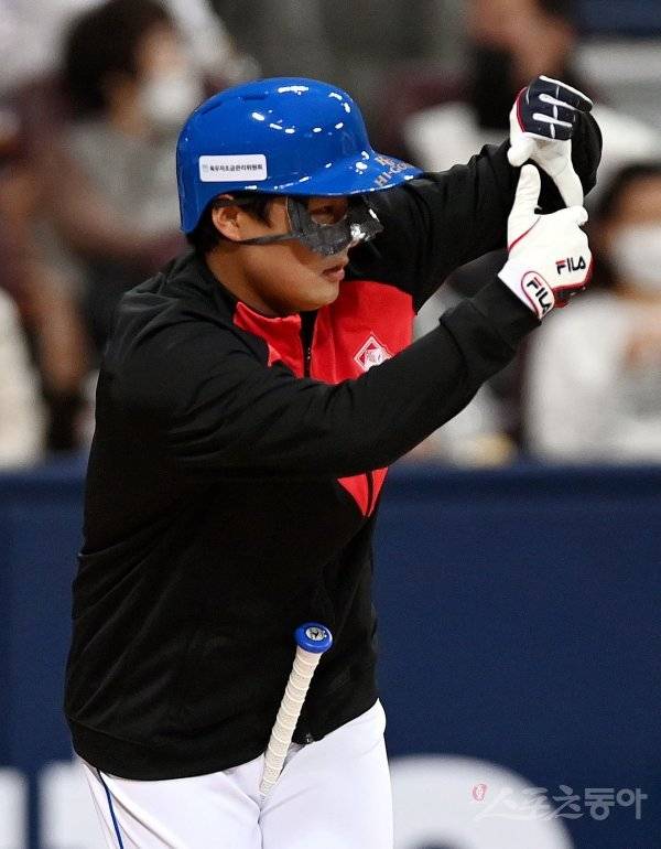 3일 서울 고척스카이돔에서 ‘2022 희망더하기 자선야구대회’가 열렸다. 양신 팀 정철원이 손흥민 마스크를 쓴 후 찰칵 세리머니를 펼치고 있다.