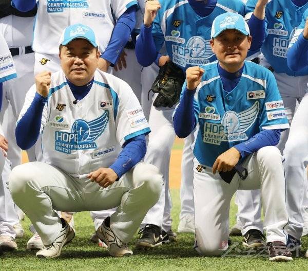 3일 서울 고척스카이돔에서 ‘2022 희망더하기 자선야구대회’가 열렸다. 양준혁과 이종범이 기념촬영을 하고 있다.