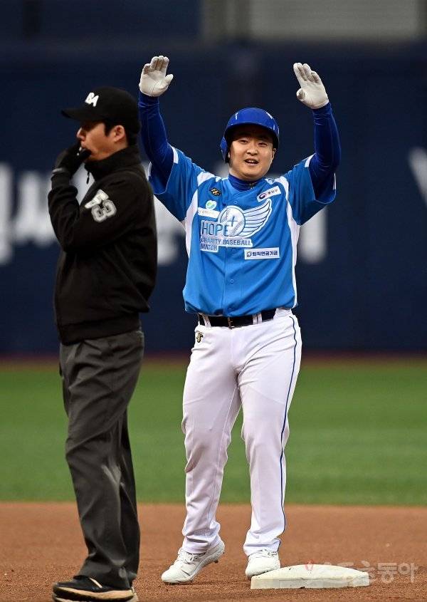 3일 서울 고척스카이돔에서 ‘2022 희망더하기 자선야구대회’가 열렸다. 1회초 종범신 팀 김재웅이 2루타를 날린 후 세리머니를 펼치고 있다.