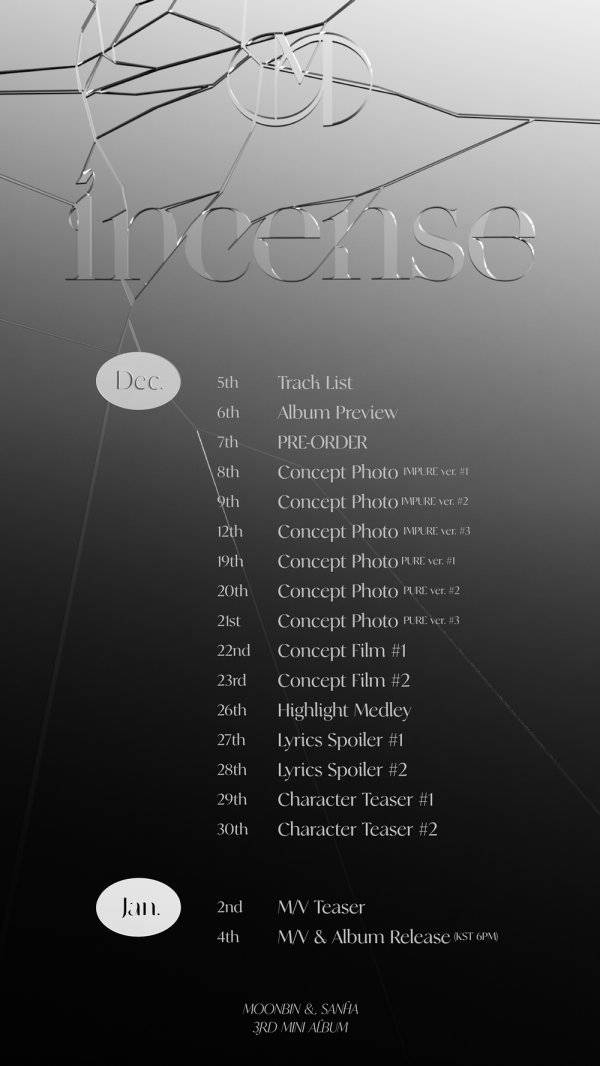 문빈&산하의 미니 3집 'INCENSE'는 오는 2023년 1월 4일 오후 6시 각종 온라인 음원 사이트를 통해 발매된다.