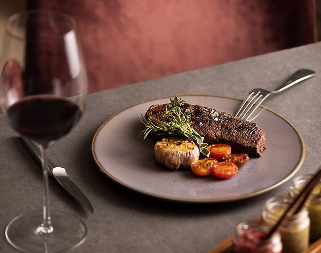 The signature menu items include Korean beef fillet tenderloin, grilled and flavored with hardwood charcoal at over 400 degrees Celsius, 28-day dry-aged Korean beef bone-in rib eye, shrimp cocktail with avocado and caramelized onion soup with cheese garlic bread.