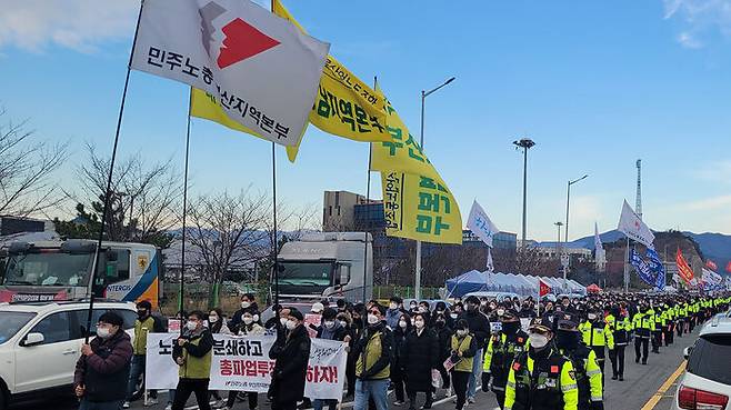 민주노총은 집회를 연 뒤 2개 조로 나눠 2부두 방향으로 1.8km, 4부두 방향으로 2.8km를 행진했습니다.