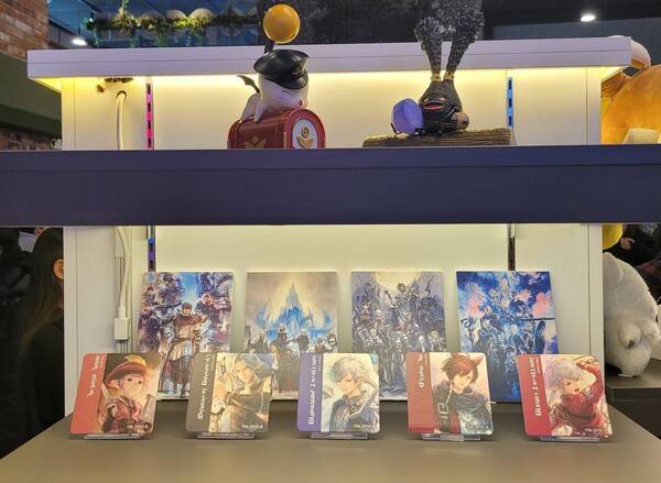 10시 30분이 지나 개장한 카페는 파판14 냄새가 물씬 느껴졌다. 입구부터 반겨주는 타타루를 시작으로 이번 카페 테마의 주연인 '새벽의 혈맹' 멤버들이 모두 벽면에 부착돼 있었다. 주문대 뒤편에는 모그리 인형, 에오르제아 설정집, 2023년 달력 등 여러 굿즈를 비치해 카페 분위기를 더했다.