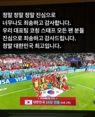 이어 "우리 대표팀 코칭 스태프 모든 팬 분들 진심으로 죄송하고 감사드립니다. 정말 대한민국 최고입니다"라고 덧붙였다.