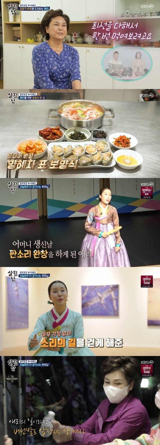 또 팝핀현준 어머니는 귀가하자마자 박애리를 위해 보양식을 준비했다. 팝핀현준 어머니는 "우리 며느리가 완창 발표회를 한다. 혼자 6시간을 해야 되는 거다. 힘들 거 아니냐. 그래서 더 잘 먹여야 될 것 같아서 며느리가 좋아하는 것만 한다. 최선을 다해 먹여보려고"라며 귀띔했다. 박애리는 팝핀현준 어머니가 차려준 밥상을 보고 감동했다.