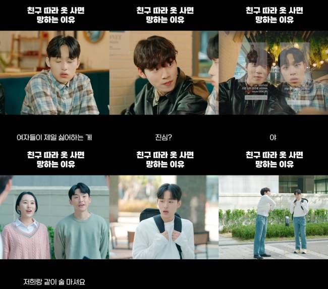 박승필(윤재찬 분)과 조재형(강병훈 분) 망한 개강총회 패션에 대해 토로했다. 틴트 선글라스와 ‘사랑둥이룩’ 모두 잘못된 선택이었다는 것. 조재형은 박승필의 지적에 “여자들이 제일 싫어하는 게 클러치백”이라고 말했다. 박승필이 클러치백을 들고왔기 때문.