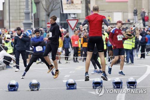 epa10346057 Participants warm up prior to the start of the 44th edition of the Escalade Race (Course de l'Esacalde), in Geneva, Switzerland, 03 December 2022. The sporting event, with over 45,000 people registered for this year's edition, takes place in the Old Town of Geneva on 03 and 04 December 2022. EPA/SALVATORE DI NOLFI SWITZERLAND OUT