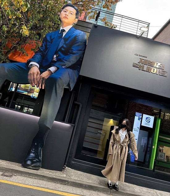 사진 속 티파니는 롱코트에 웨이브 머리를 하고 주연배우 송중기가 커다란 입간판으로 세워진 입구에 서있는 모습이다. 또한 그는 포토존에서 사진을 남기는 등 알차게 체험공간을 즐긴 모습이라 미소를 안겼다.