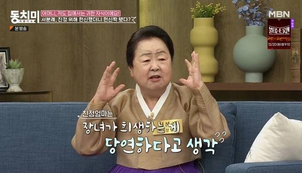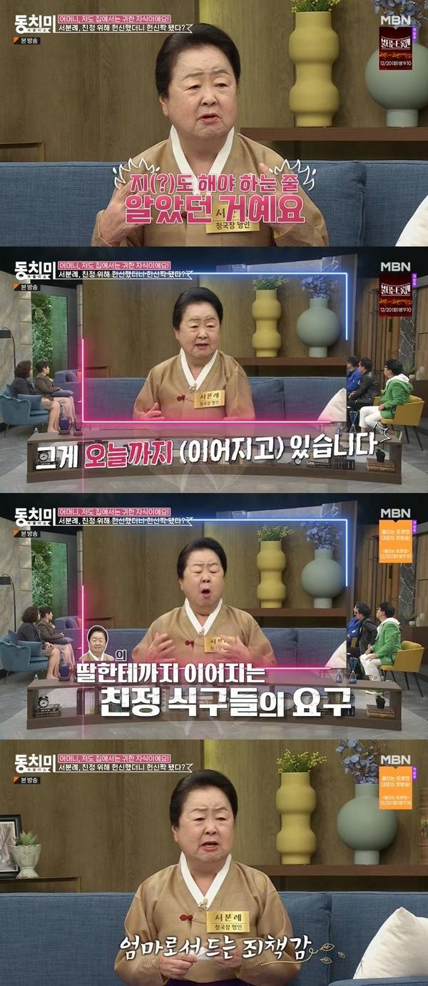 서분례는 “시어머니가 내가 얼마나 밉겠냐. 양귀비라도 미울 것 같다. 우리 엄마는 내가 시집살이하는지 관심도 없었다. 내가 애 낳았을 때 시어머니가 잠깐 없었는데 (친정 엄마가) 미역국 한 번 안 끓여줬다. 우리 엄마가 너는 당연히 해야 한다고 생각했다. 나도 해야 하는 줄 알았다. 그게 오늘까지다. 내가 관속에 들어갈 때까지 해야 할 것 같다”고 억울함을 토로했다.