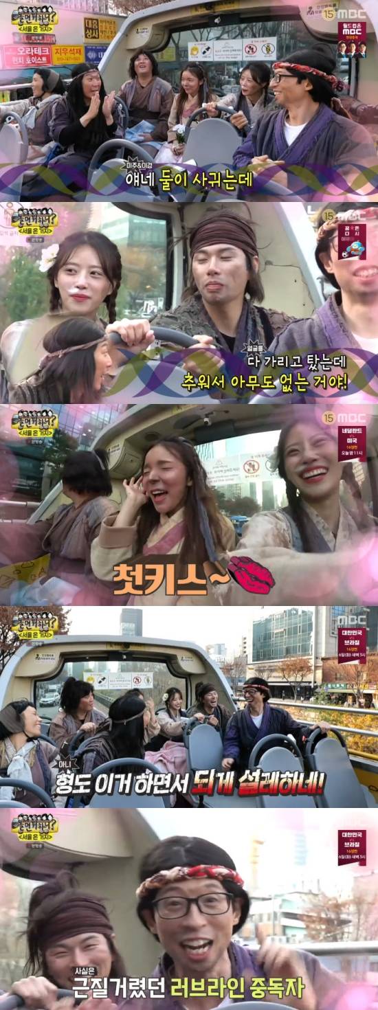 또 멤버들은 미주가 원했던 서울 시티 버스에 탑승했고, 이이경이 가고 싶어 했던 인사동으로 향했다. 이이경은 "데이트하기 너무 좋다"라며 감탄했고, 하하는 "(이이경과 미주) 애네 둘이 썸을 타는데 연예인이니까 가리고 탔는데 추워서 아무도 없는 거다. 깍지 끼는 거다. 뒤돌아 보니까 아무도 없어서 첫 키스하는 거다. 이경이가 (담요) 챙겨오고 뒤에 앉았는데"라며 상상의 나래를 펼쳤다.