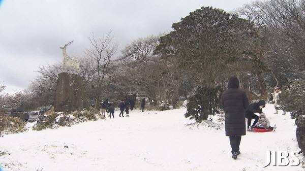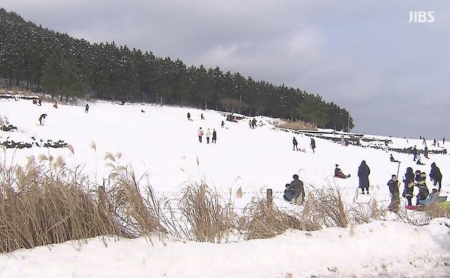 겨울철 눈이 많이 내린 중산간이나 경사진 언덕에서 썰매나 스노보드를 즐기는 사람들이 눈에 띄곤 합니다.