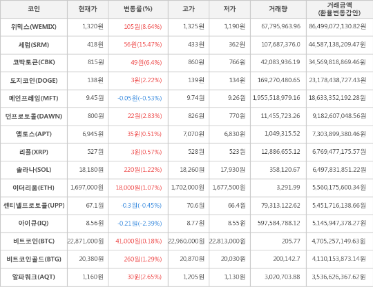 한편 거래금액 기준으로는 위믹스, 세럼, 코박토큰 순으로 가장 활발한 거래를 보이고 있다.