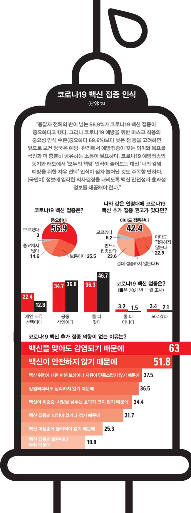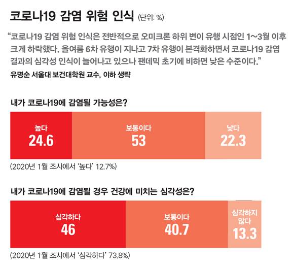실제로 코로나19 유행의 장기화에 따른 피로감이 쌓이면서 국민의 경각심이 떨어졌고 백신과 감염으로 획득한 집단면역도 감소세다. 대부분의 방역 조치가 중단된 상황에서 개인이 할 수 있는 일은 거의 없다. 정부 차원에서 지속 가능한 방역망을 구축하고 방역 당국이 국민과 현실감 있는 소통을 하는 일만 남았다. 이를 위해 정부는 최근 코로나19 대국민 인식을 조사했다. 중앙사고수습본부 의뢰로 유명순 서울대 보건대학원 교수팀이 11월3~7일 전국 성인 남녀 1000명을 대상으로 감염 위험, 재유행 위험, 일상 회복, 예방 행동, 백신 접종, 정책 등에 대한 국민의 인식을 살펴봤다.