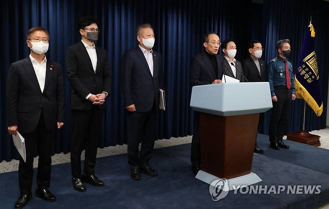 (서울=연합뉴스) 서명곤 기자 = 추경호 경제부총리 겸 기획재정부 장관이 4일 오후 서울 용산 대통령실 청사에서 열린 화물연대 집단운송거부 대응과 관련한 관계장관회의를 마친 뒤 회의 내용에 대해 브리핑하고 있다.왼쪽부터 이정식 고용노동부 장관, 한동훈 법무부 장관, 이상민 행정안전부 장관, 추경호 부총리, 원희룡 국토교통부 장관, 이창양 산업통상자원부 장관, 윤희근 경찰청장 2022.12.4