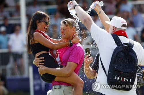 epa10347474 Adrian Meronk of Poland celebrates his win with his partner on the 18th green during the ISPS Handa Australian Open 2022 golf tournament at the Victoria Golf Club in Melbourne, Australia, 04 December 2022. EPA/CON CHRONIS AUSTRALIA AND NEW ZEALAND OUT
