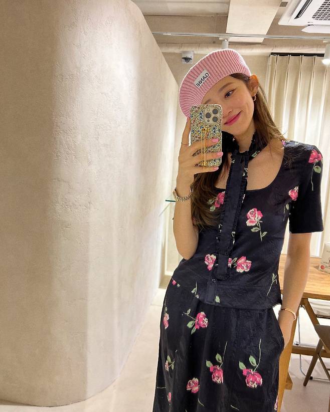 사진 속 서하얀은 짙은 네이비에 장미가 그려진 의상을 차려입고 '셀피'를 촬영중이다.
