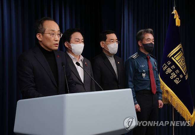 (서울=연합뉴스) 서명곤 기자 = 추경호 경제부총리 겸 기획재정부 장관이 4일 오후 서울 용산 대통령실 청사에서 열린 화물연대 집단운송거부 대응과 관련한 관계장관회의를 마친 뒤 회의 내용에 대해 브리핑하고 있다.왼쪽부터 추경호 부총리, 원희룡 국토교통부 장관, 이창양 산업통상자원부 장관, 윤희근 경찰청장. 2022.12.4