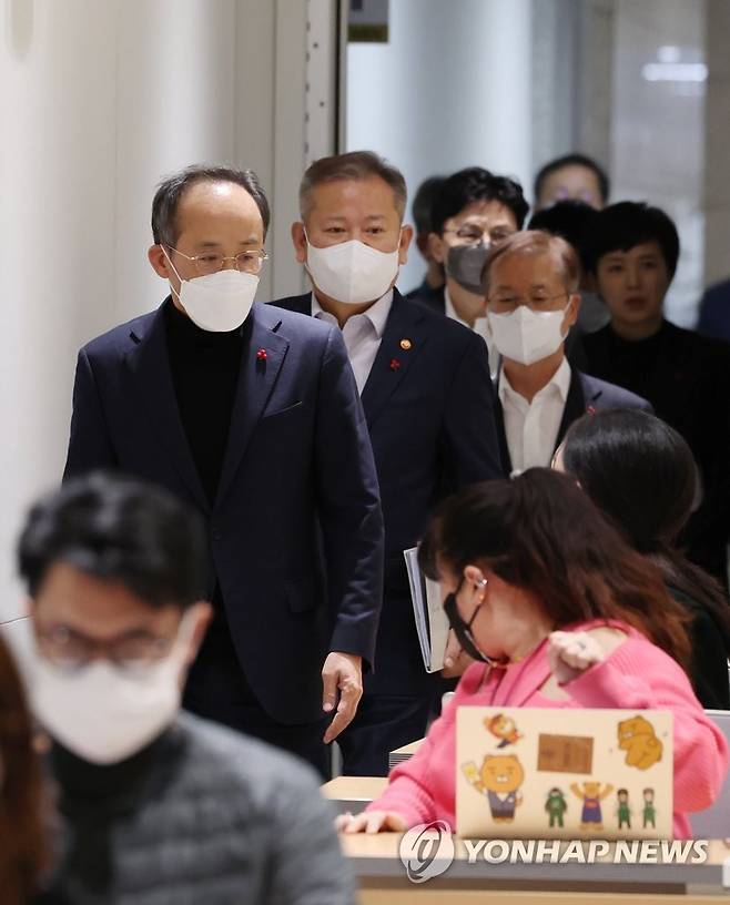 (서울=연합뉴스) 서명곤 기자 = 추경호 경제부총리 겸 기획재정부 장관이 4일 오후 서울 용산 대통령실 청사에서 열린 화물연대 집단운송거부 대응과 관련한 관계장관회의를 마친 뒤 브리핑을 하기 위해 이상민 행정안전부 장관 등과 함께 브리핑룸으로 들어서고 있다. 2022.12.4