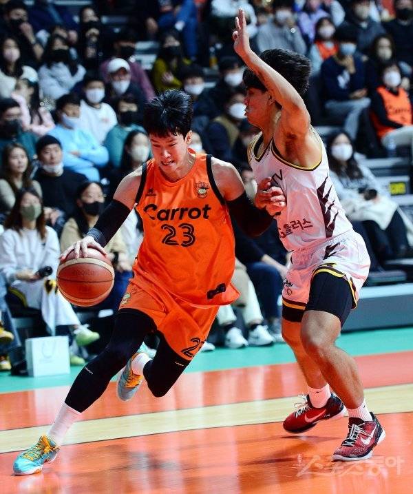 4일 경기도 고양체육관에서 열린 ‘2022-2023 SKT 에이닷 프로농구’ 고양 캐롯과 창원 LG의 경기에서 캐롯 전성현이 LG 수비를 피해 돌파하고 있다.